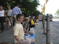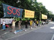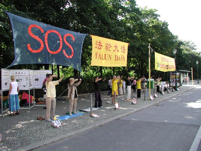 经过五昼夜在总理府前的风风雨雨,8月21日天气格外晴朗。弟子们挂起“法轮大法”、“SOS”、“来自中国的呼吁:130人已绝食20天”等横幅及架起死难者照片的展板,一遍一遍地向世人展示五套功法,并在炼功的间歇发正念。