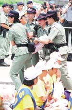 [图]香港警方以法轮功学员绝食静坐阻碍人行道,展开拘捕。这是北京镇压法轮功以来,香港警方对法轮功学员的首次拘捕行动。