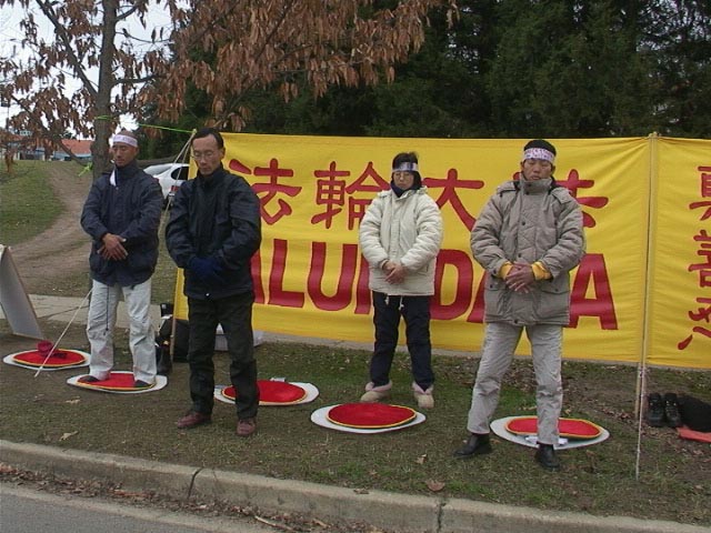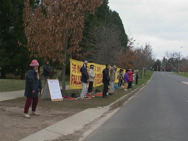 早上7、8、9点钟,绝食弟子、部分坎培拉弟子和部分悉尼弟子共20多人,端坐於中国大使馆对面,立单掌於胸前,3次齐发最纯净、最坚定的正念“法正乾坤,邪恶全灭!”
