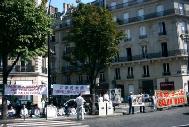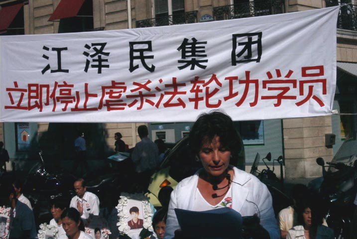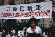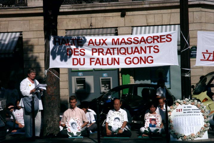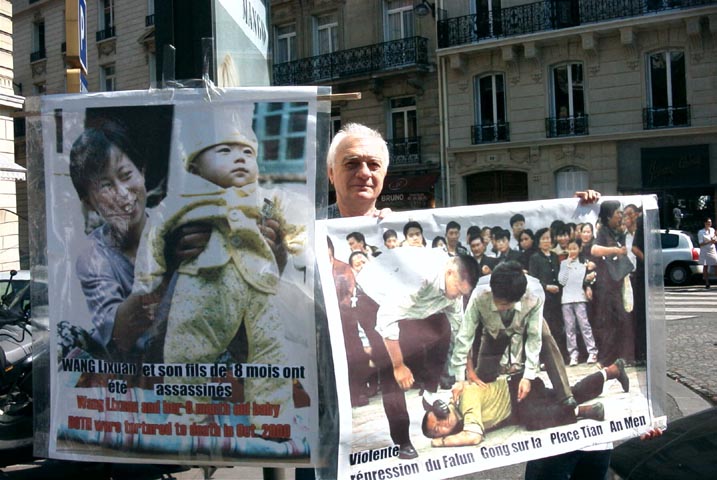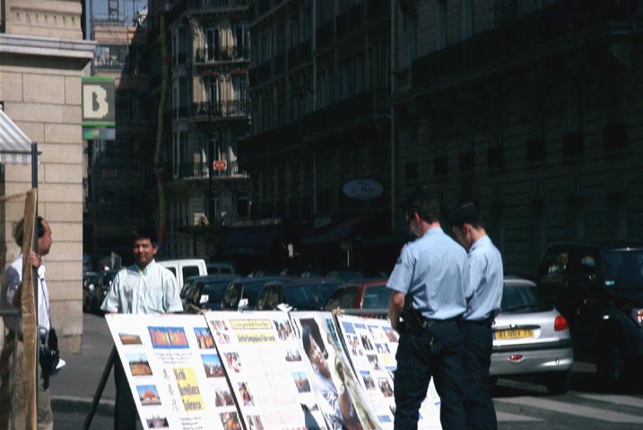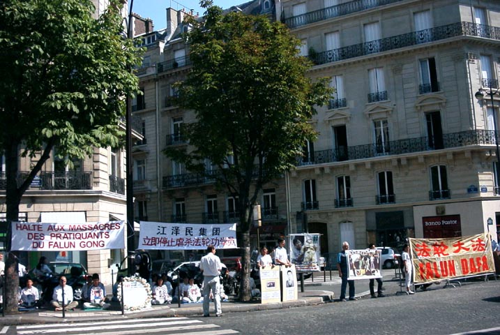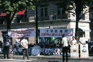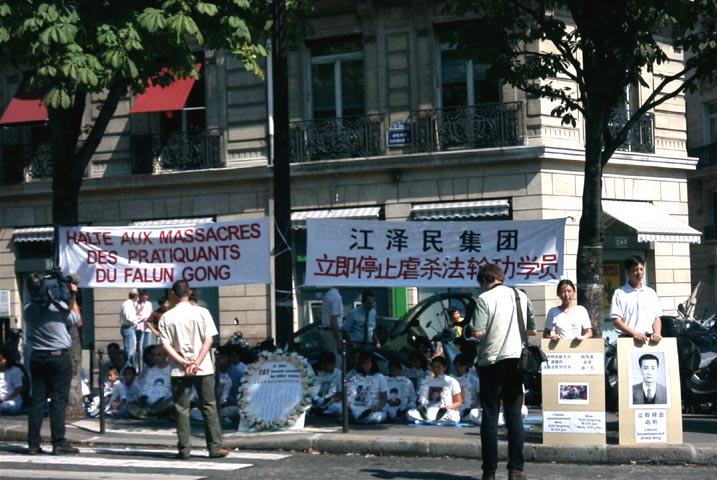 学员们拉起了“江泽民政治流氓集团:停止虐杀法轮功学员”的横幅;竖起了揭露野蛮迫害的大幅照片;摆出了最近回国探亲在中国内蒙古无故被抓的在法国生活学习的三名法轮功学员的照片;也摆出了已被非法关押一年多、饱受酷刑迫害的法轮功学员赵明的照片及国际大赦组织呼吁中国政府立即释放赵明的请愿信。