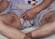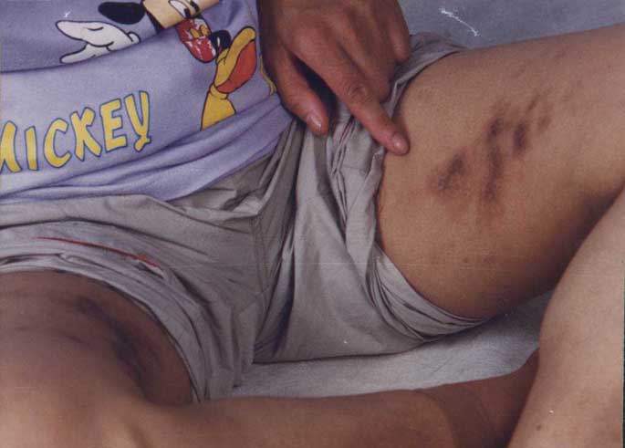 有一天杨林和我说:“队长还责怪我们不会打,不让我们打头,应该往身上打,别人看不见。等到厕所没人的时候,它们又把我带到厕所,杨林(抚顺)等6人,把我的棉裤扒下来,分别抱着我的两条腿在腿的内侧用手指甲掐一点肉来回拧,一直拧到掐破流血为止。叛徒一边掐我一边说着下流话,简直就象卖淫小姐。它们一直掐了我一下午。第二天我看到被掐的地方全化脓了,面积有4寸长,3寸宽(见照片),内裤和棉裤都被脓血浸透。我让杨林看我的伤口,并要了一条破毛巾,撕开两条,因毛巾没毛很硬,往两条腿的化脓处没皮的肉上一放真是撕心裂肺式的疼痛。第二天,叛徒一齐扒我的棉裤还要掐我的腿,它们把我按倒在地,按着解我的裤带绳,因为绳结了死扣无法解开,找剪子没找着,王容(沈阳)说找针扎她,可是剪子和针干警都收起来了,于是它们就坐在我的身上,把笔往我的手里塞,我不服从它们就一齐把着我的手,拿来信纸它们好几双手把着我的手强行地把笔硬塞到我的手里,并按照它们自己的话把着我的手写了悔过书和骂师父的话,再写上我的名字,说交给队长,并且还念给我听,然后大笑起来。更让我不能容忍的是它们把骂师父的话写在一张纸上,……(编者注:邪恶之徒的行为极其无耻,无法描述),说完后它们就搂在一起大笑起来。