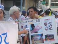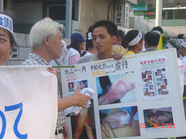 下午四时来了三位日本人(大学名誉教授、作家、社长)到绝食队伍前,了解了发生在中国的紧急情况后,即刻打电话呼吁媒体,请他们马上采访报导。临行前还将自己身上的钱送给大法弟子表示声援,但被大法弟子婉言谢绝,表示感谢。