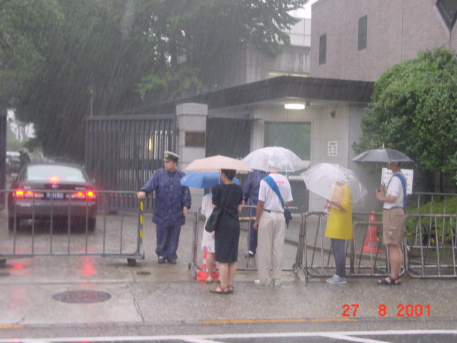 8月27日下午2时,4名学员带着信和标语准备给大使递交请愿信和资料。突然开始下雨了,大使馆的工作人员告诉门警,不准让他们进入。他们告诉门警,中国人有权利进入自己国家的使馆,但没有用。雨突然下大了,递信的学员瞬间被淋湿了,但他们打开了信,大声朗读起来。有两家电视台记者将这动人的历史的一幕记载下来了。只听到一名女学员流着泪大声说,“法轮功学员修炼真善忍,有什么罪?270名学员被残酷虐杀,现在又有130名学员生命危在旦夕,我们上访请愿是宪法赋予的权利。”无论如何请求,仍是不准入内。
