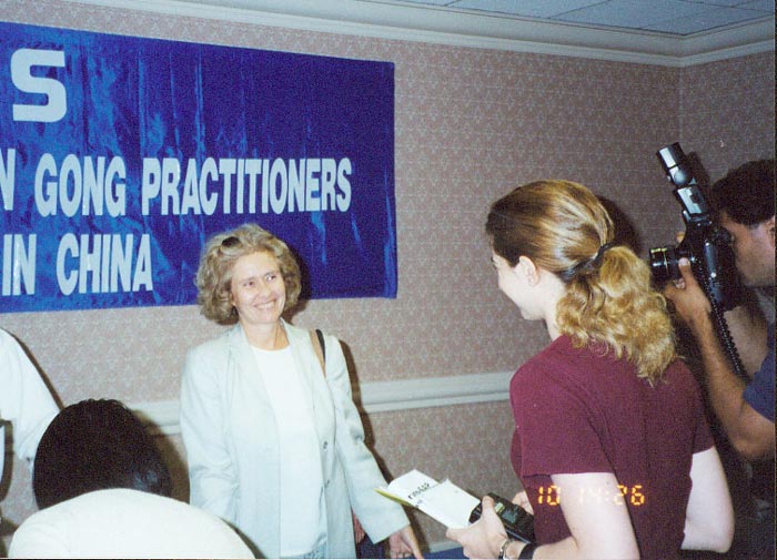 会上宣读了致江泽民的抗议书,对大陆不断升级的迫害法轮功学员表达了强烈的抗议,严正要求立即无条件释放马三家劳教所130名绝食的大法弟子,呼吁世人伸出友爱之手帮助这些善良无辜的人。会上还宣读了给联合国秘书长安南的呼吁信,敦促安南秘书长向人权恶棍江泽民传递世界各国人民强烈关注法轮功修炼者在中国受迫害的信息。记者招待会结束后,安南的安全助理收下了弟子们的呼吁信。