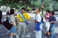 清晨,阳光明媚。居住在中国大使馆附近的居民,在上班,上学的路上,看到的第一件事就是路边陈列的中国迫害法轮功的一幅幅触目惊心的图片,以及经历了一夜绝食和露宿,笑脸相迎的法轮功学员们。几乎每一个人都接过了我们的讲真相资料,学员们的无私付出触动着每一个人的心。特别令人感动的是一群群天真无瑕的孩子们,他们有的会仰起头,看着我们,用稚气的声音问“我们可以怎样帮助你们呢?”当他们得到答复后,总是慎重地收好资料,满意而去。