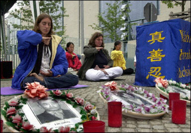 法新社德国报导 - 大约50名法轮功运动的中国和德国成员在柏林外交部前请愿,反对在中国对这一打坐运动的镇压。在大幅宣传画上他们要求德国外交部长费舍对中国[江泽民]政府血腥镇压法轮功的行径予以官方谴责。近两周来该运动的数名成员相继在柏林中国大使馆前绝食抗议。