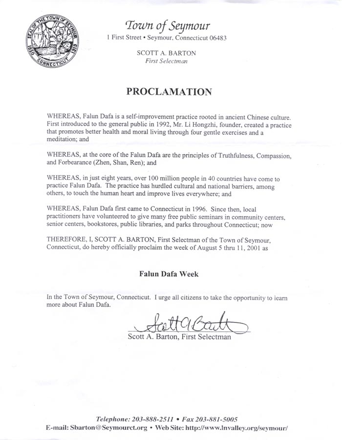 【明慧网2001年8月4日】康涅狄格州赛莫镇宣布2001年8月5日至11日为“法轮大法周”。