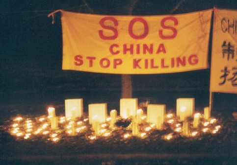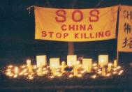 100多盏小小烛光在风中闪烁,星罗棋布地点缀在15盏大型蜡烛和展牌周围,以此纪念那些为捍卫大法而献出生命的修炼者们,此情此景,催人泪下。