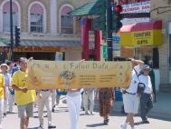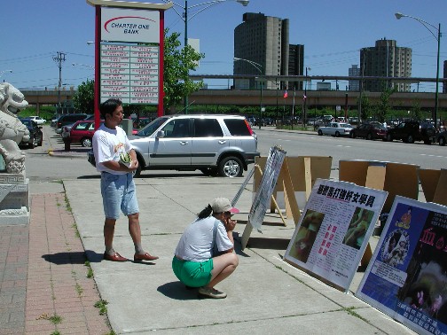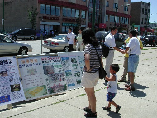 另一方面,全面向华人讲清真相的每周图片展仍然在中国城举行。一面是宁静、美好的游行队伍,一面是江泽民暴力团伙残害大法弟子的图片,鲜明的对比使许多华人驻足观看,仅一个小时就发出传单上百张。一位无知的老太太接过传单后恶狠狠当着学员的面把传单扔在了地上,正巧被一群走过来的中国人看到,学员无怨的捡起传单,擦拭干净,继续发放,那一群中国人被学员的善良感动,纷纷走过来,每个人都接了一张传单。