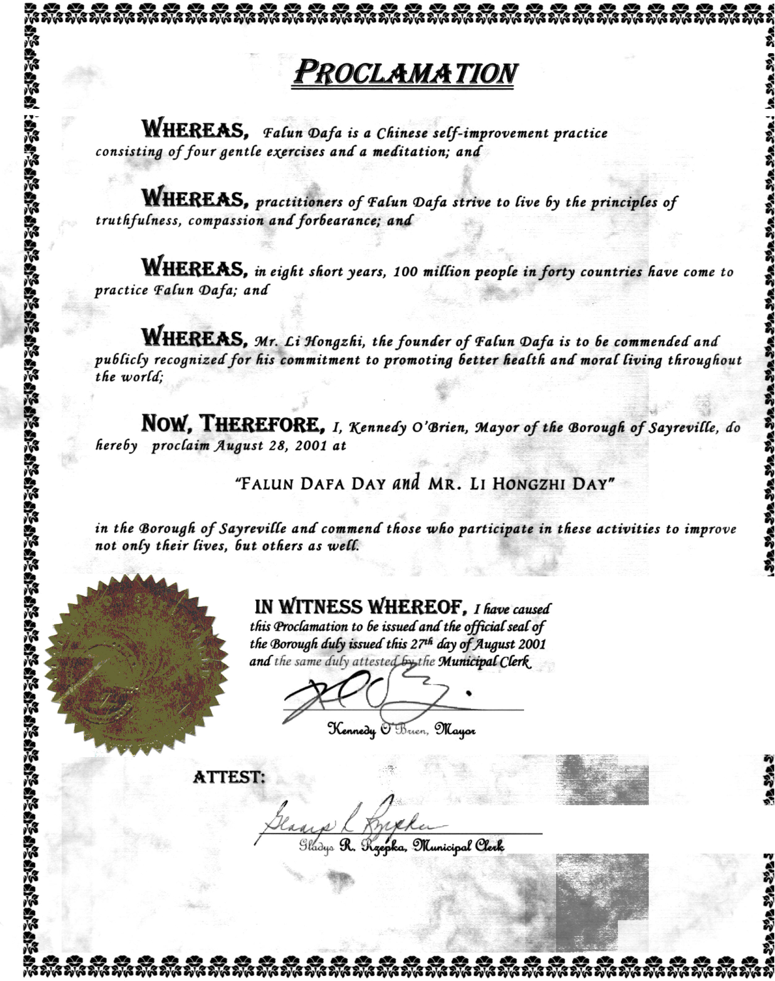 【明慧网2001年9月1日】为表达对法轮大法的支持和对中国镇压法轮功的反对,赛芮维尔市市长奥布岚先生特宣布2001年8月28日为该市“法轮大法日和李洪志先生日”。