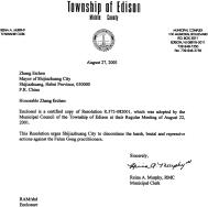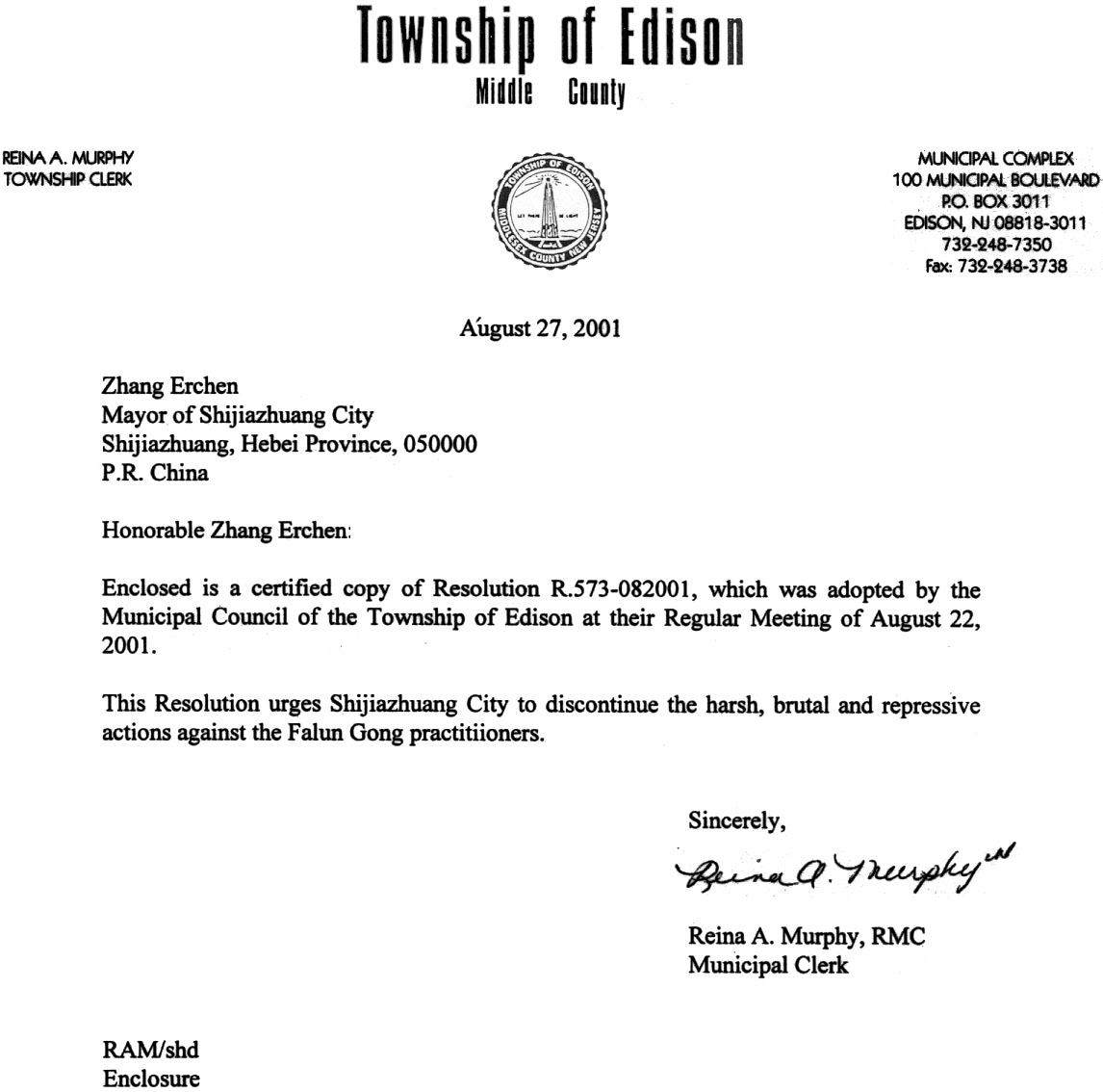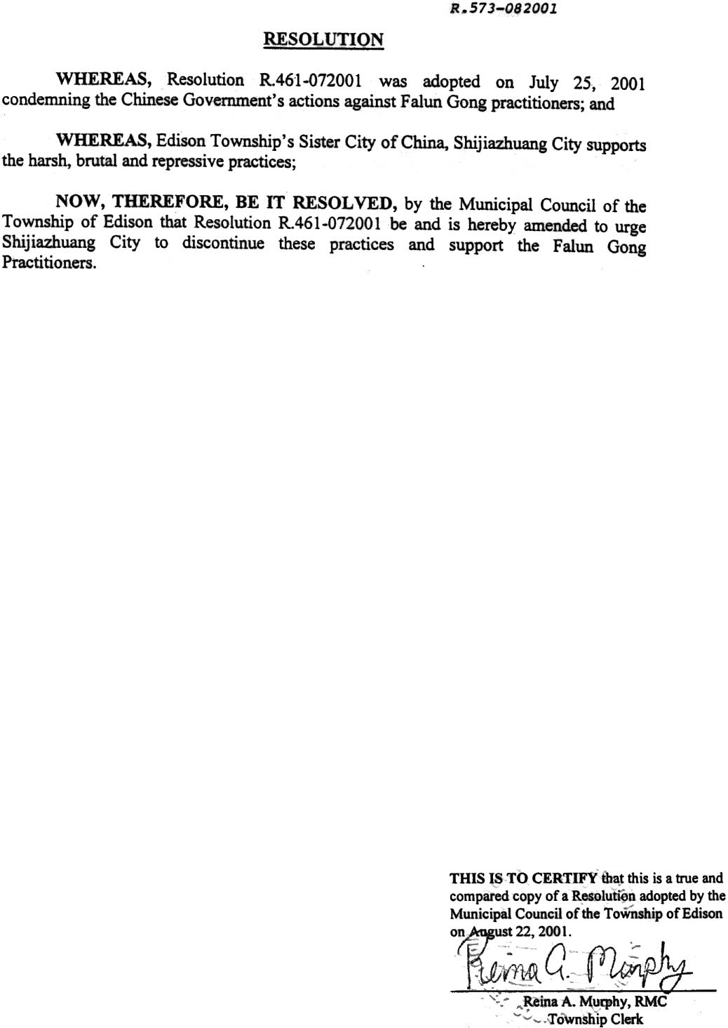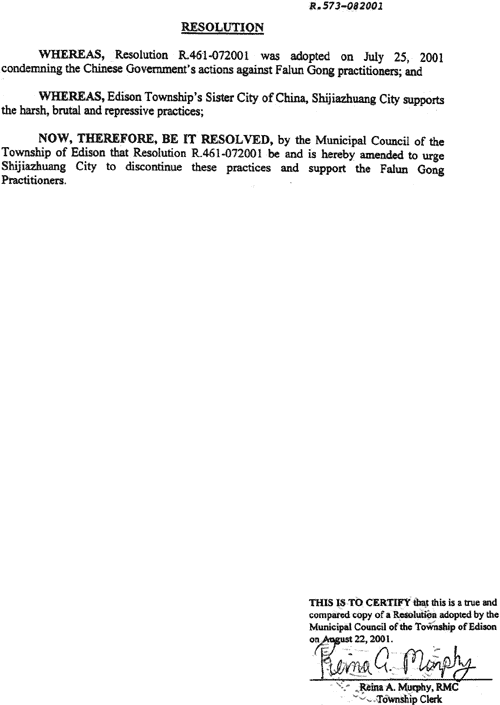 【明慧网2001年9月1日】鉴于石家庄市当局对法轮功学员的日益升级的迫害,在8月22日的市议会上,爱迪生市议会再次全票通过573号决议,敦促姐妹市石家庄停止镇压法轮功学员。市议会已于8月24日将决议副本寄往石家庄市长,中国驻美大使,中国驻纽约总领事,新泽西州联邦国会众议员和参议员。