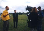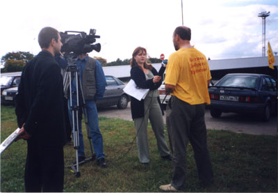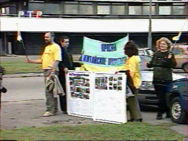 我们站在机场外交通道的出口,向前来采访访问活动的媒体记者们发放了“SOS,法轮功”的报章。有三家大型电视台立即现场采访了我们,给了我们向公众揭露中国当局非法镇压的机会。
