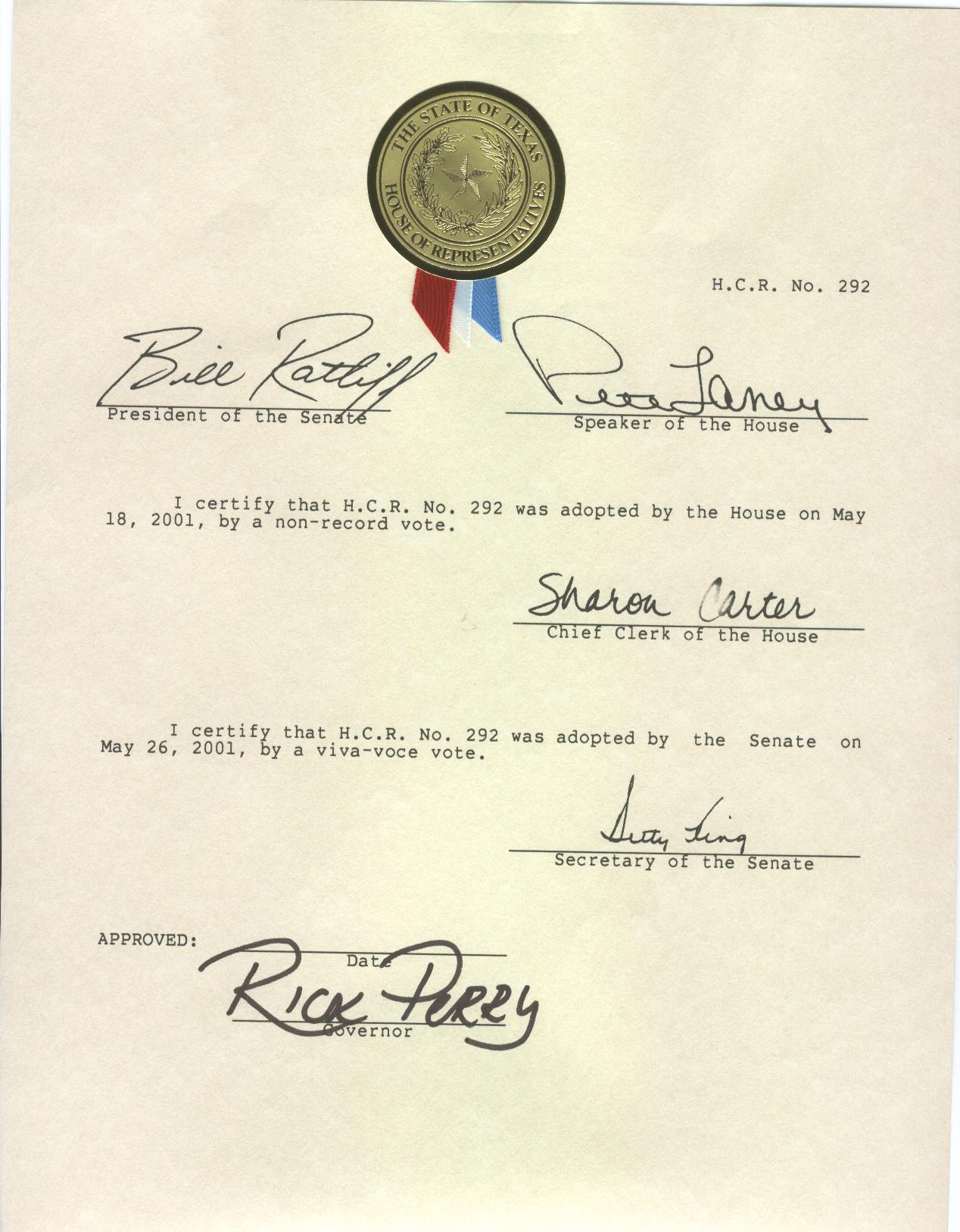 决议如下,得克萨斯州第77届州议会宣布2001年6月为得克萨斯州“法轮大法认知月”并向修炼者的未来致以最美好的祝愿。