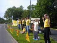 【明慧网2001年9月12日】今天(9月10日)是我们为声援马三家劳教所大法学员的伟大抗争,在中国领事馆前举行连续绝食抗议的第十天。学员们轮流进行48小时绝食。我们在路边搭起帐篷,以便让绝食的学员过夜。大型的标语和展板揭露了马三家劳教所和中国其它地区对学员残酷迫害的罪恶行径。一个横幅上清晰地写着:“善有善报,恶有恶报”,这句话是对那些参与作恶的人的善意规劝。