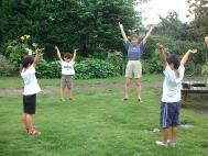 一对黑人弟子夫妇为了这次洪法活动做了许多工作。两天内,许许多多的黑人与大法结缘。他们不但欣然接下传单,还积极地学炼功法。有时,炼完一套静功,周围便坐着一圈小孩儿,认真地闭着眼睛模仿着做着不标准的动作。家长们则在一旁笑呵呵地静静地看着;有的家长鼓励着害羞的孩子们也加入进来。其中一个小孩儿学完后跑到母亲面前席地而坐,给母亲表演了起来。有个黑人老奶奶,看到黄T恤便主动走过来要求坐下,紧接着便问是否可以随着一起炼功,还问在什么地点炼功更合适,她告诉我们她的一个朋友是纽约的法轮大法弟子。今天,她欣喜地一眼见到我们,就迫不及待地请求学习功法。有的是夫妻一起学炼法轮功的,有的是一家老老少少学炼的。大部份学的人都是一学就是很长时间,很认真,久久不愿离去。傍晚,发完正念,回头发现一个母亲带着两、三岁的小女孩儿坐在我们的背后,两个小女孩儿结着印坐着。其中大一点的女孩儿还双盘着。