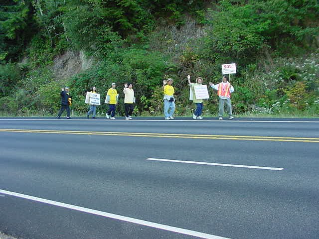 法轮功学员向行人发送“SOS紧急救援在中国受迫害的法轮功学员”的传单。美联社(AP)、路透社(Reuters)、中央社等采访了这次活动。在得知镇压事实真相之后,路人纷纷签名表示支持法轮功学员的行动。