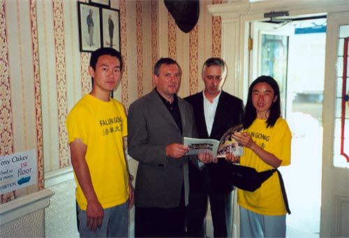 汤米问我们,是谁帮我们联系了电台,我们告诉他是芭芭拉女士。他说没准我认识她呢。汤米在国际特赦克拉凯尼小组作义务成员已经有很多年了,所以非常有经验。他说,我带你们去见一个议员,只是不知道他在不在。汤米开车带我们来到了议员约翰.米基尼斯的办公室。巧得是,约翰.米基尼斯先生正在办公。秘书告诉汤米你们自己上去吧,他在楼上。看得出汤米和他们的关系很好。约翰.米基尼斯先生请我们入坐后,仔细听我们介绍国内迫害的情况,而且非常关心赵明的处境。他说,以前也读过一些有关法轮功的报导和资料,但是总是没有今天和你们面对面地谈感到更加真切。他表示一定会想办法帮我们。他又问了汤米联系了当地的媒体了没有,汤米告诉他我们刚从电台出来,但是报社的记者在休假,只有主编一个人,正忙着采访艺术节,没时间来。米基尼斯议员说我来给他们打电话。他说着就拨响了他面前的电话,他终于把忙得团团转的摄影记者找到了,并约好了见面拍照的事。议员先生在得知我们下一站要去的地方是沃特福得的时候,就又跟沃特福得的电台打电话,给我们联系好了要找的人,可以接受采访。看见汤米和约翰议员如此设身处地替我们着想和服务,我们的心里岂止是感动两个字能形容的,真是人类的语言不够用了。