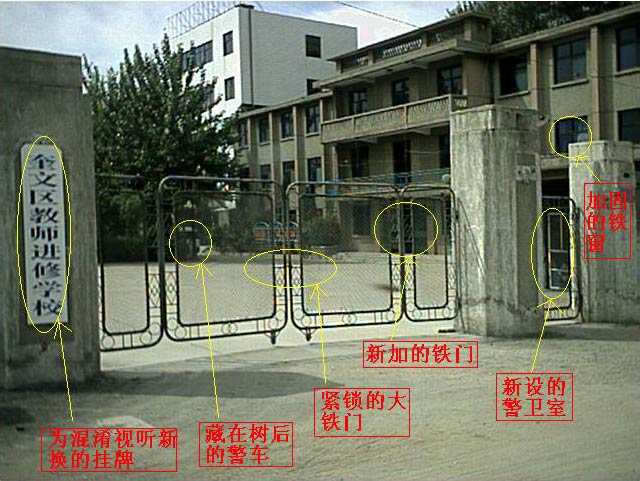 【明慧网2001年9月17日】 潍坊市工业干校(现改名为“奎文区教师进修学校”)从去年就成为残酷迫害、非法关押大法弟子的邪恶之地。2000年10月份开始,对大法弟子进行封闭式强行洗脑,每天高音喇叭里播放着谎言,震耳欲聋,对大法弟子进行精神摧残,不写“保证”不放人,有的关押长达数月。由此“工业干校”这一名称臭名远扬, 为掩人耳目现改名为“奎文区教师进修学校”,现在这里每天大门紧闭,楼道里还增加了铁门(见照片),隐蔽处停放着警车(见照片),关押大法弟子的一、二层楼全部安装了铁窗。大门口原“传达室”现改为“警卫室”。