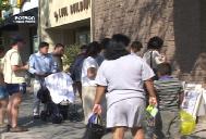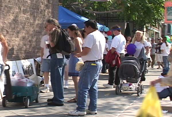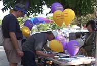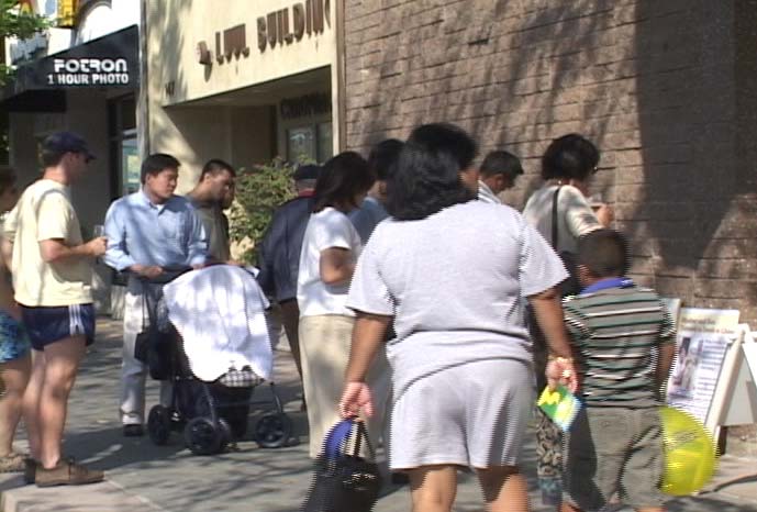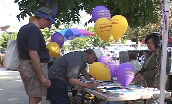 由于展示摊位在街拐角里,过往行人少一些,学员们就把介绍大法、同修遭受残酷迫害及弟子们面对邪恶走出来证实大法和紧急呼吁的展版放到附近临街处,使熙熙攘攘的行人都能看到。在这两天的活动中,看展版的行人真是多得难以估计。几乎所有的人看了展版都痛斥邪恶的迫害,敬佩大法弟子的正行,只看到极少的几个华人受邪恶宣传的影响而不理解。