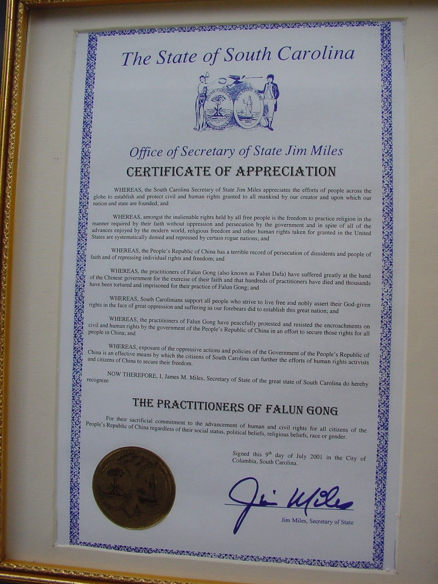 因此现在,我,杰姆.迈尔斯,南卡罗来那州州务卿,在此褒奖