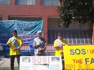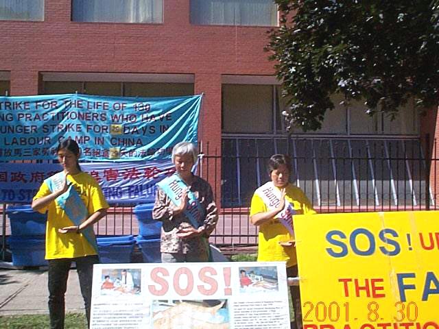 9月1日(星期六),是澳洲弟子绝食接力的第10天。在中国驻澳大使馆前,每天都有来来往往的中国旅游团到此,弟子们在大使馆前竖立的醒目横幅“法轮大法”、“绝食请愿,呼唤良知”,也震撼着旅游团的游客,每当有旅游团到来时,学员们都祥和地递上真相材料,尽管许多中国游客迫於江泽民的淫威而不敢接,但却悄悄地对学员们竖起大拇指表示理解和支持。