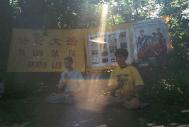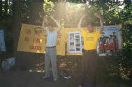 我们展示了很多真相图片,也准备了很多紧急救援传单。我们每天集体炼功、学法,期间多次发正念。祥和的炼功场面吸引了众多路人。简单明了的真相图片向行人讲述了一个个法轮功学员被残酷迫害的故事。行人见了,无不动容。