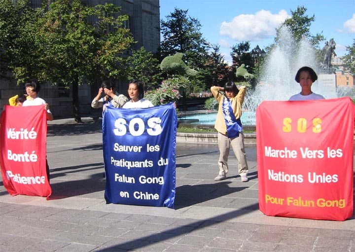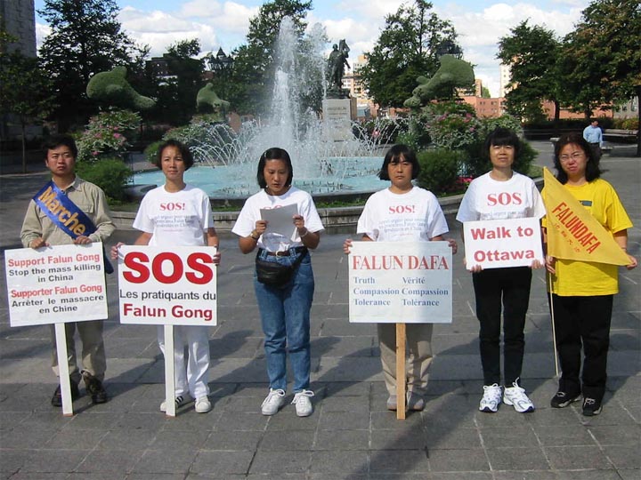 【明慧网2001年9月20日】今天,我们六位蒙特利尔法轮大法修炼者加入“SOS紧急救援 停止虐杀法轮大法修炼者”环球步行活动,起程走向首都渥太华,走到纽约联合国总部,呼吁加拿大政府紧急救援在中国的法轮大法修炼者,要求中国政府立即停止迫害法轮大法;呼吁全世界人民共同行动起来制止江泽民政治流氓集团对法轮大法及修炼者的长达两年的残酷迫害。