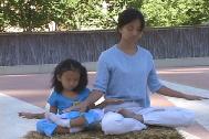 在九月十五日这天,法轮大法学员同时参加了三项活动:健康节,体育活动节和艺术节。由艺术家法轮大法学员设计制作的休息亭摆放在市中心圆形广场的最中央,亭子里铺着手工编制的草垫,亭子四周环绕摆放着供打坐用的草垛。在大法音乐的伴奏下,近二十名学员同时演炼法轮大法的第五套功法,整个场面既祥和又壮观。习惯了都市生活的人们,当意外地看到这片宁静和祥和后,纷纷加入其中……