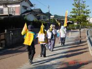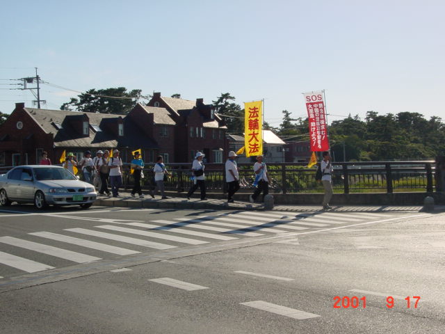 学员们又继续步行了三个小时,于下午一点左右到达福冈县古贺町市役所。一位人事科长接见了全体学员,接受了学员们递上的真相材料。学员们又继续步行,于晚上六点多到达福冈县东福间市,并在这里露宿。当学员们正在花园里休息时,一个约十五、六岁的男孩一直在学员周围转,一会儿看看学员书包上挂着的“世界紧急救援步行活动”的图片和“法轮大法”的大旗,一会儿又在学员旁边听学员读经文。一位年长的女学员发现了这个男孩的举动后,便过去打招呼,他说想了解法轮功。于是这位学员就把他领到一位日本籍年轻学员那里,那位学员便给男孩讲法轮大法的真相。男孩听得特别认真,久久没有离去。最后我们把一份日文大法报纸送给男孩,告诉他如果想学,可以跟报纸上的联系人联系。那男孩接过报纸后这才离去。