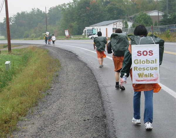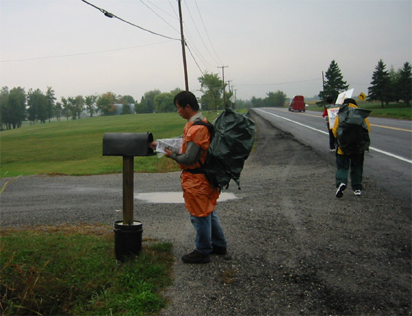 几天来,大家晚上在草地上搭帐篷露宿,白天背着装有洪法资料的很重的背包行进。虽然大家脚上的水泡浸湿了袜子,甚至泡上叠泡,但是在烈日之下,我们一边走一边听着师父的讲法录音或背诵经文,往沿途的邮箱发送洪法资料,给路人洪法,以一个大法弟子的胸怀,一步一个正念的前进。有的居民拿到资料后驱车赶上我们,询问法轮大法是什么;更多的居民则是从广播中得知我们的SOS步行营救行动,当我们到达此地时,他们伸出大拇指,对我们说,我们的心和你们在一起,你们做的好,做得对。