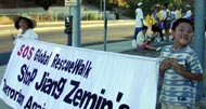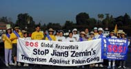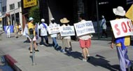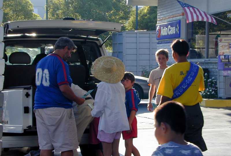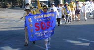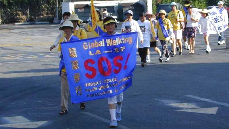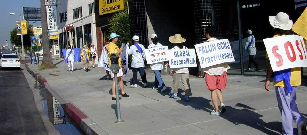 【明慧网2001年9月25日】金秋的南加州依然骄阳似火。九月二十一日清晨,十几位法轮功学员继续从洛杉矶市西部的好莱坞区进发, 沿Ventura大街向前跋涉,学员们举着印有SOS全球步行紧急救援横幅分两组向街旁的路人派发真相资料。无论是开车而过或是沿途行走的路人大多都为学员们坚定的意志所感动,很多人竖起大拇指,鸣喇叭或做出V字形的手势祝福学员。中午当学员们在一栋公寓前绿地上暂停休息打坐时,一位西人男士过来说,“我住在这里,刚才我看到你们打坐象一幅美丽的画面,你们从哪里来?为什么选择在这里打坐?”学员们告诉他关于570哩SOS紧急救援步行的详细情况,并呼吁世人伸出援手,帮助我们停止江泽民集团对法轮功的虐杀。学员们只是路过休息。他听后非常感动,双手握住学员的手说,“请等我一下,我马上就回来”,片刻他从楼上下来,把一打可乐悄悄地放在学员身后,然后不动声色就走了。