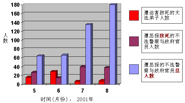 最近短短的4个月(2001年5月至8月),据不完全统计,因残酷迫害法轮功学员而遭受恶报已突然死亡的警察和政府官员高达120人,另有325人仍在遭受重病、车祸后等的煎熬。