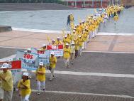 前方有徐徐为我们开路的警车,后面是大法弟子整齐的步行队伍,分别从台北和宜兰两条路线沿途步行下来的同修,他们坚毅的脸庞在竹笠帽的衬托下尤显道骨仙风,那缓缓移动的黄色T恤辉映得整条马路金光灿烂,正法之路何浩荡!