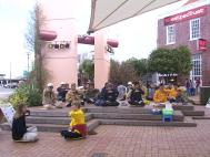 这一天和游行那天一样,是德国很少见的大晴天。街上的行人格外地多。由于这个广场处于交通要道旁边,又在中国节广场附近,常有满载中国人的大轿车从我们面前驶过。红灯时他们就停在我们炼功场地的前面。车里的每个人都在读横幅上的“法轮大法”和“真善忍”三个字。