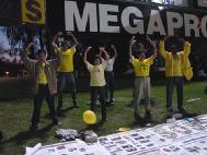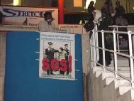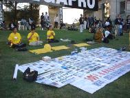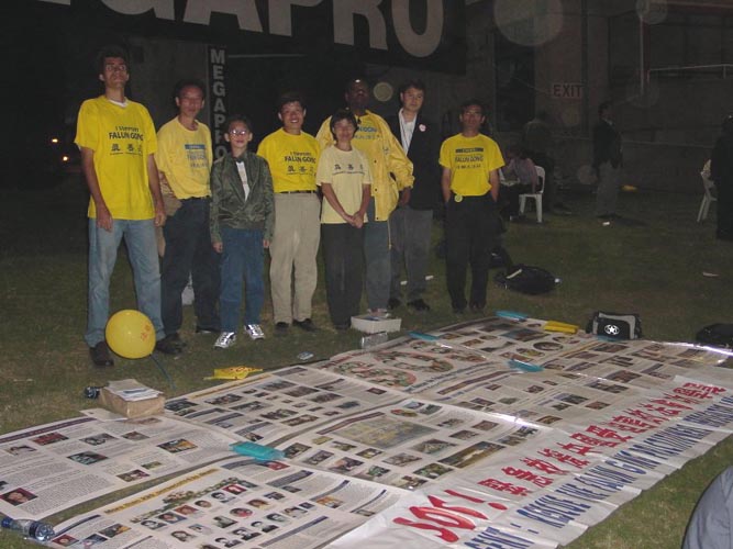 下午的非政府组织闭幕会,大法弟子动作最快,我们将红底黄字的“法轮大法”横幅挂在主席台对面最显眼的看台上,同时我们还把“SOS紧急救援”的大型图片挂在最主要出口处的上方,进进出出的人们都能看到。当时警察还曾要求我们把大法旗帜拿下,但我们心念一正,简单一句话,“这个旗帜上没有任何有政治色彩的东西”,于是警察就不管了。