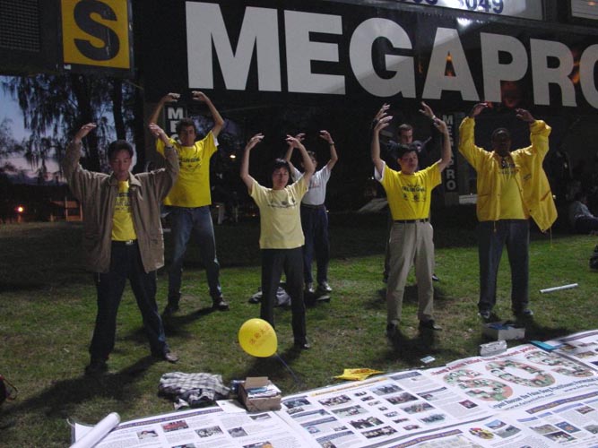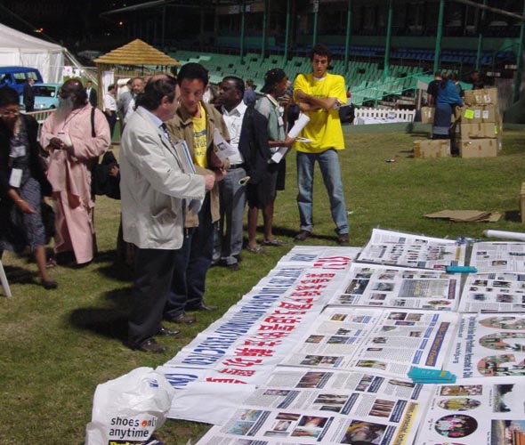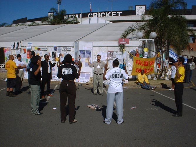 好在来自南美的瓜得陆朴(GUADELUOPO)的理查德较早就赶来帮忙。他们俩在大会场最显眼的入口正对面搭起宣传架,一人炼功,一人发资料,配合默契。瘦高的理查德几乎每次大活动都不落,日内瓦、瑞典、美国、非洲,地球太小了。另一个很活跃的是来自南非周边国家的温土路,他是我们中唯一的黑人,去年他就飞到台湾声援。来自澳大利亚的大卫已经扎根在非洲洪法三个月了,他说几乎没有一天停止过教功。在许多城市和乡村的洪法时,他往往一个地方住几天,开班介绍大法,然后直到培养出有比较稳定兴趣的新学员,他就换个地方,然后过一段时间再重返此地,看看人们坚持得如何,提高得如何。来德班支援之后,他说还有四个地方已有联系,可去开班洪法。另外新加坡还有四位同修也赶到了,其中一位是小弟子。他们昨晚半夜才到,今天一早五点就起来炼功,白天派发资料,参加游行,丝毫不松懈。