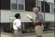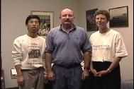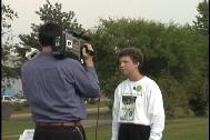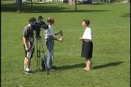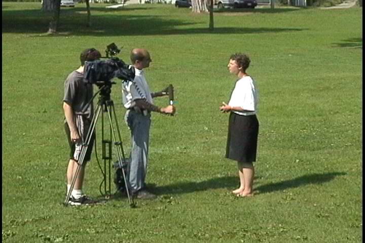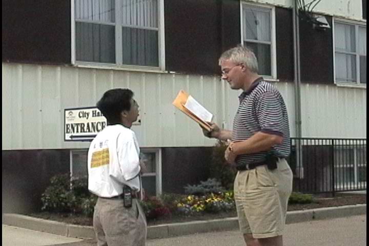 我们给市长留下了一套资料,接待员送给了我们圣约翰堡市(也是北部和平国家一部份)的别针。我们向公立图书馆捐赠了法轮功的书籍和法轮大法教功录像带并在下午到达百年公园。地方电视台的摄影师赶来给我们摄像,在开始采访我们时,他感到累了。然后,他主动拍摄我的黄夹克背面写的真、善、忍。稍后,当我们炼法轮功时,这位摄影师用自己的时间返回来看我们炼功达许多分钟。后来,他向理查德询问了一些挺有深度的问题,如关于基督教和法轮大法的关系问题。我们被这名男子的心感动了。