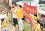明报:港法轮功学员高举横额及派发传单抗议再办邪恶图展