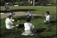 同撒斯卡屯的学员在班德希尔(Bandshell)一起炼功记者在班德希尔加拿大电视广播公司记者
