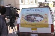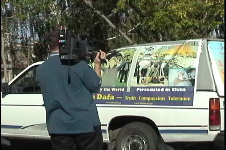 另外,在静坐活动开始前,法轮功学员还举行了汽车游行,他们在汽车上贴上图片及横幅,引起了很多人驻足观看。