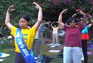 接着,大法弟子在预先准备好的展位前炼功洪法,征集签名,紧急救援大陆受迫害的法轮功学员。众多游人兴致勃勃地学炼了功法。看了展位前江泽民政府对法轮功学员残害的照片,人们纷纷对这种法西斯的行径进行谴责,并祝法轮功学员好运。