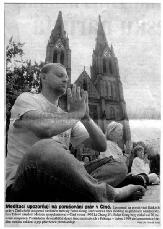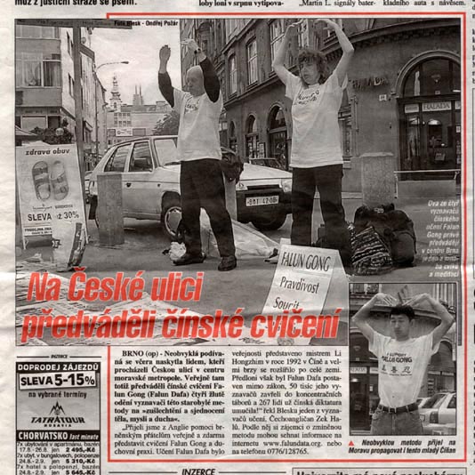 乘公车来到捷克共和国莫拉瓦的首都布鲁。同在布拉提斯拉瓦一样,我们得到了善良人及地方官员的帮助,取得了‘难以取得的’且是城中最繁忙地段的许可。这一次我们没有去网络咖啡屋发电子邮件,而是直接到各媒体办公地告诉他们我们的事情。他们派来了记者、照相师和电台采访。第二天,我们就在报纸上看到我们的功法演示。