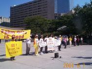 在美国首都华盛顿,法轮功成员结束在中国大使馆外的绝食行动后,由国会山庄展开游行,要求北京释放被囚的法轮功成员。二十多名法轮功成员身穿黄色T-恤,部份成员会步行三日至一个星期,其中一名成员更计划由华盛顿行路往四千多公里外的洛杉矶。