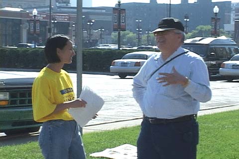 积极活跃于劳动节的美国参议员斯苔比诺女士和国会议员庞尼尔先生愉快地接下了法轮功学员讲清真相的资料,并再次表示对法轮功的支持。此二位议员对法轮功一贯支持。庞尼尔先生又是国会188决议案的联合发起人之一。
