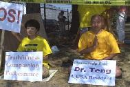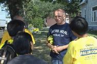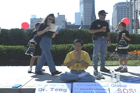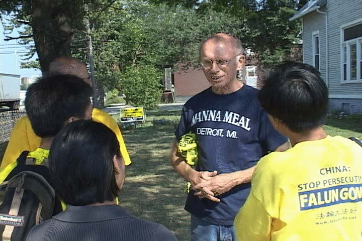 劳动节当天下午,布什总统来到底特律市与本地的Teamster工会成员共享野餐。学员们早早到位,并通过洪法得到了一位美国人Tom的支持。Tom听了学员们的洪法后,将他屋子的前院提供给学员们作为洪法的场地,使学员们得以在离总统必经的入口处占有一有利的地形。学员们打出的大法横幅在阳光下徐徐生辉,很远处就那看到。十余名身着金黄色T恤的学员一排席地打坐,或发正念,或炼静功,神情肃穆端庄,与隔街的其它团体形成鲜明对照。庄严悦耳的普渡、济世音乐随风飘进在场人们的耳中,也飘进了总统举行野餐的地方。