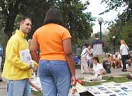 星期五,一位学员刚开始向人们发传单,发到一个摊位时,摊位里的一个人就冲她吼道:“你不能在这发传单。”当时这位学员很平静,她一边发正念,一边把传单递给那人身旁的一个人,这个人接过传单后,这位学员就讲中国法轮功学员所遭受的迫害。当她离开时,她对那个吼叫的人说:每个人都应该帮助制止这残酷的虐杀。他还向这位学员点点头。
