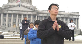 当犹他州的立法者们在议会大厦里忙着为即将到来的立法会议做准备时,法轮功成员们在议会大厦前的台阶上炼习着他们的身心修炼功法。这个源于中国的古老精神功法星期一获得了州长麦克尔.莱维特(Michael Leavitt)的褒奖,他宣布了犹他州的第一个“法轮大法日”。