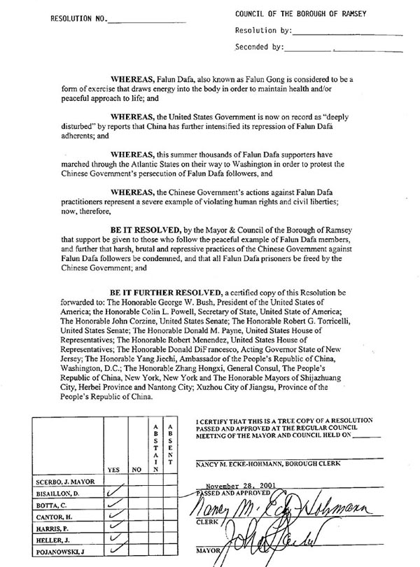 拉姆塞镇镇长和镇议会决议,支持作为和平典范的法轮大法修炼者,强烈谴责中国(江泽民)政府对法轮大法修炼者粗暴无理的残酷镇压,要求释放所有被监禁的法轮大法修炼者;并且