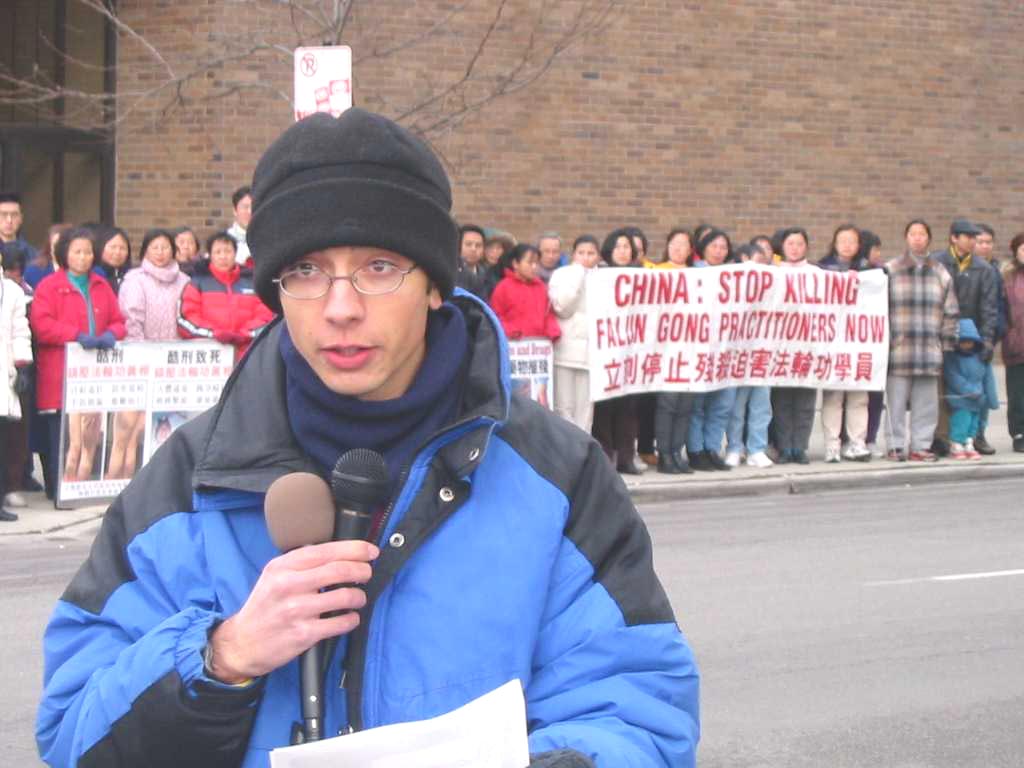 【明慧网2002年1月14日】1月12日星期六下午,大法弟子继续前往中国驻芝加哥领事馆和平请愿,抗议江氏政权近期的残暴杀害大陆法轮功学员的罪行。但见上午还乌云翻滚,并急促地下起漫天雪花的天空,到下午大法弟子来到中领馆前时已开始云散天晴,透出碧蓝的长空。弟子们在领馆前宣读大法弟子的严正声明和伊州政要对江氏集团迫害法轮功的严词谴责,声讨江泽民集团所犯下的毫无人性的暴行。