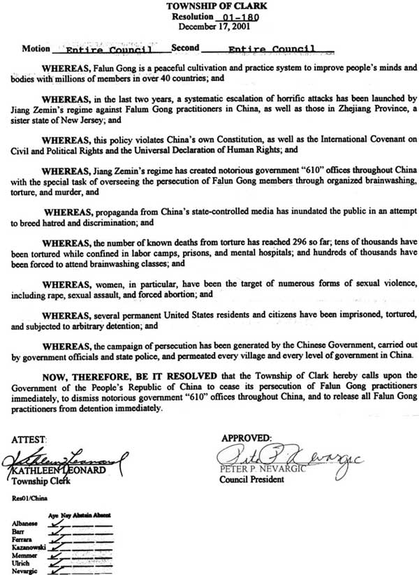 鉴于,在过去的两年中,江泽民集团发动了对中国法轮功学员以及新泽西州的姐妹省--浙江省法轮功学员的系统的恐怖的升级迫害;并且